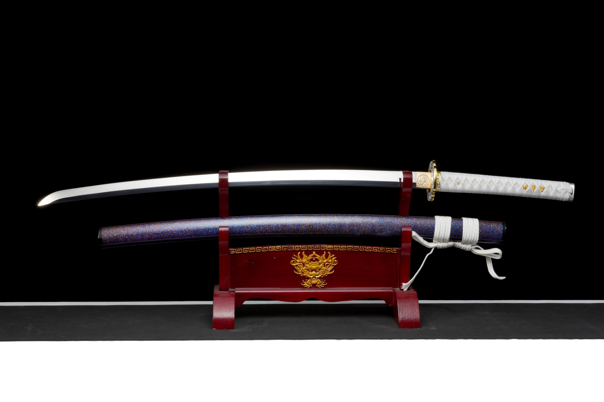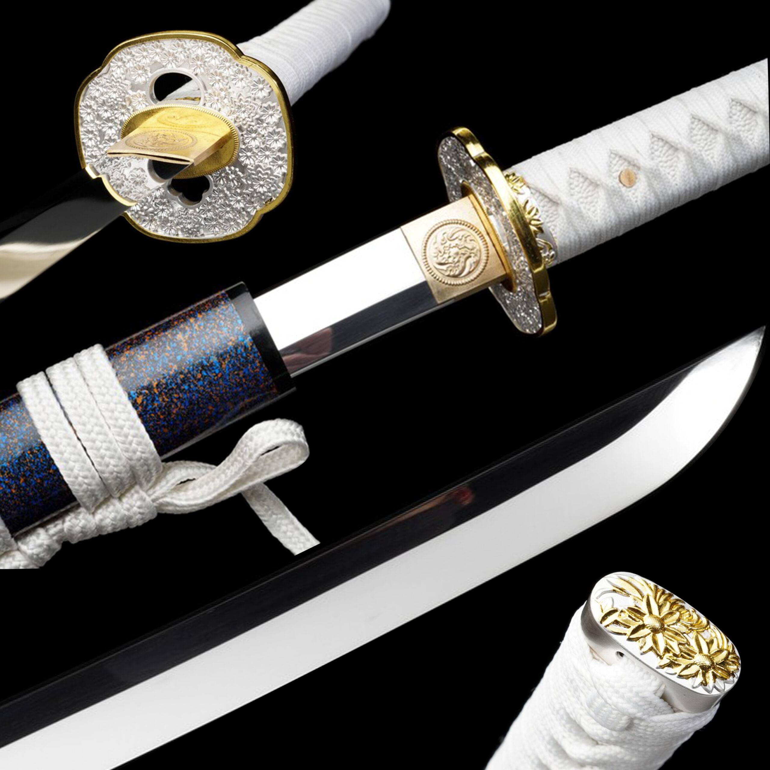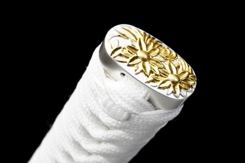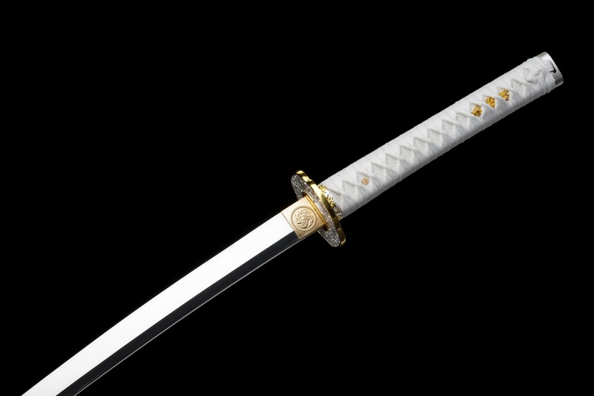 Crafted with the integrity of centuries-old smithing traditions, this battle-ready katana features full tang construction for absolute safety during use. The fittings are a work of art in themselves—a two-tone silver and gold alloy tsuba with intricate motifs that complement the sword’s noble character. Whether you are slicing through tatami mats or admiring it on a stand, ‘The Frozen Star’ offers a perfect balance of lethal functionality and breathtaking artistry.