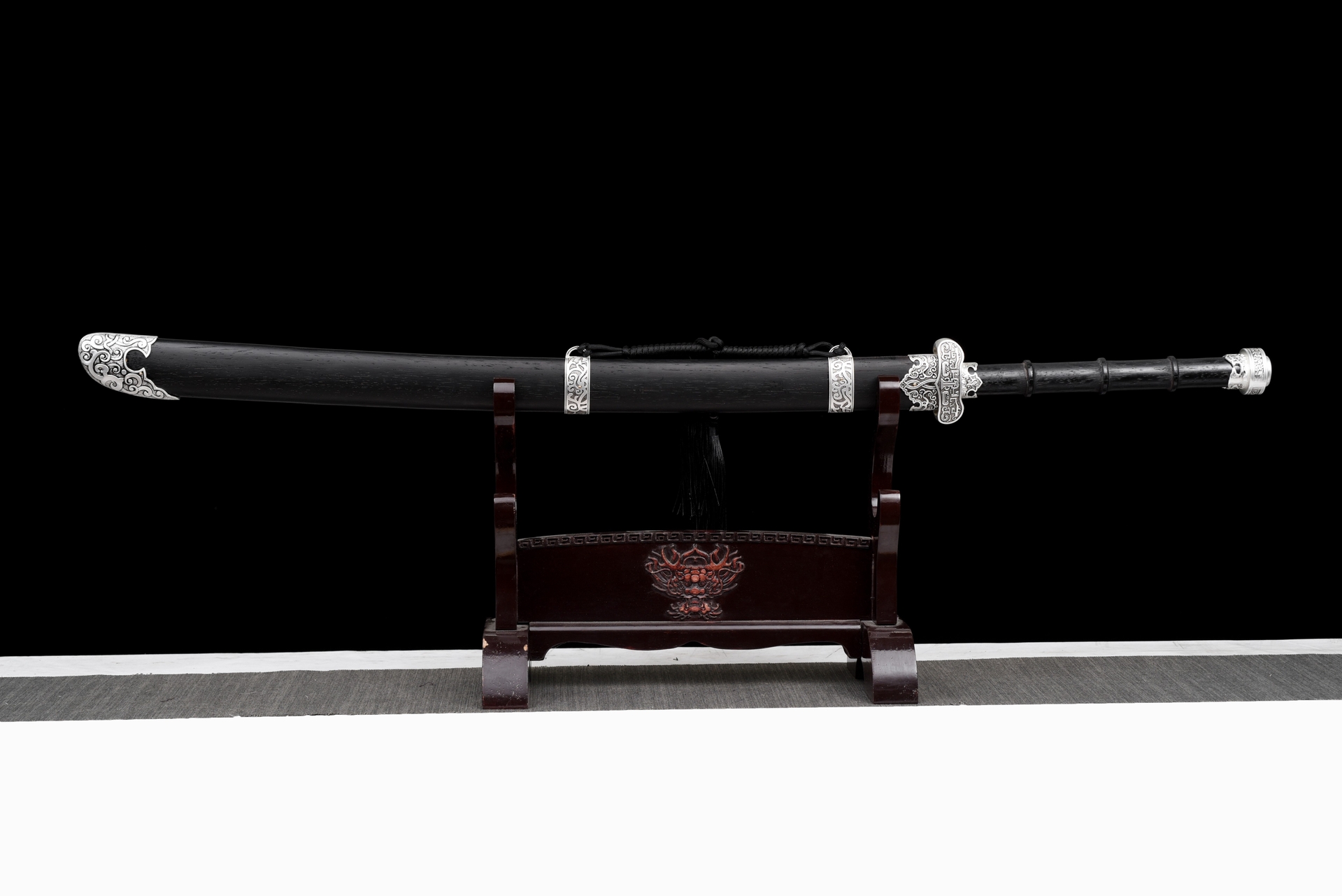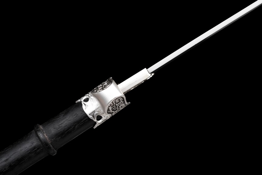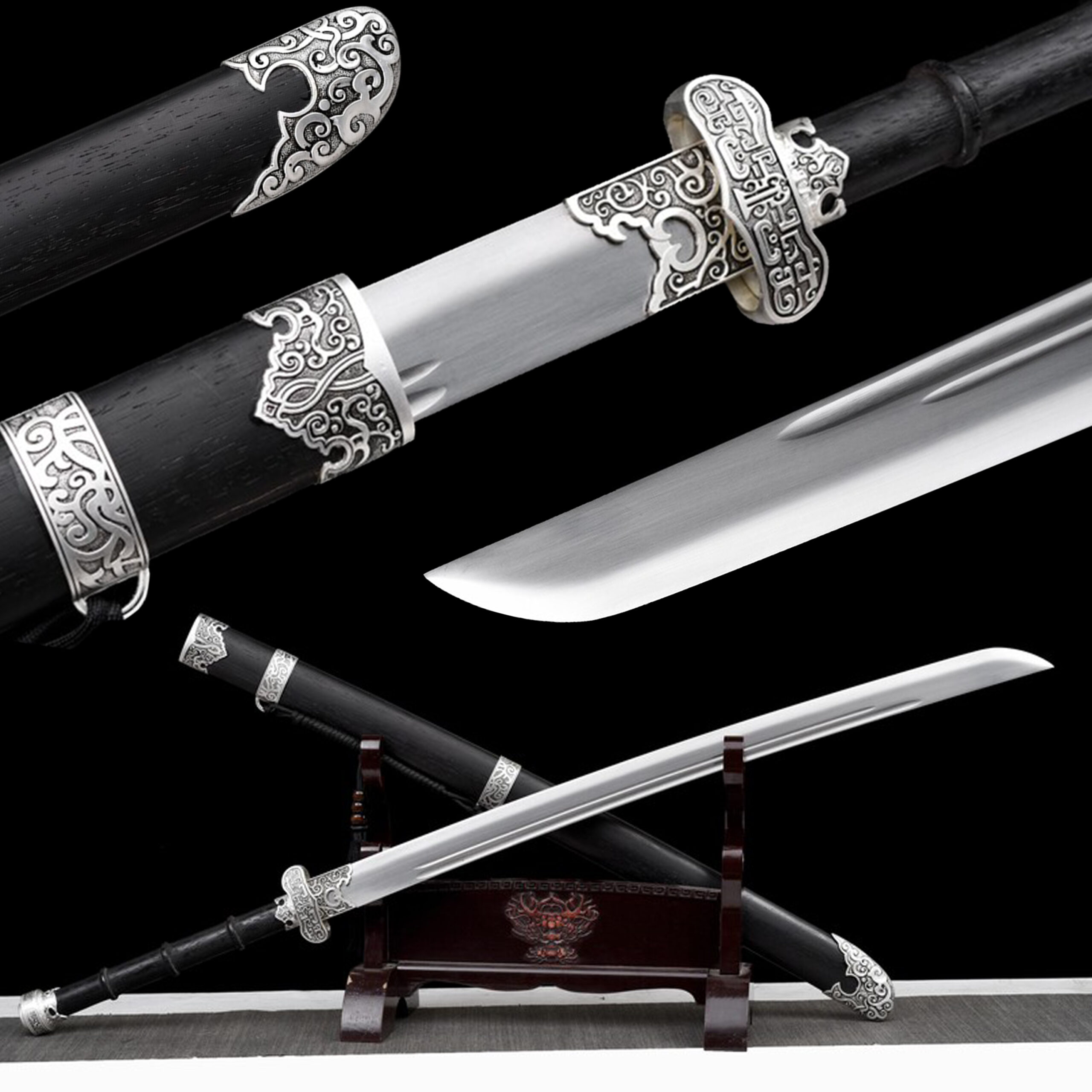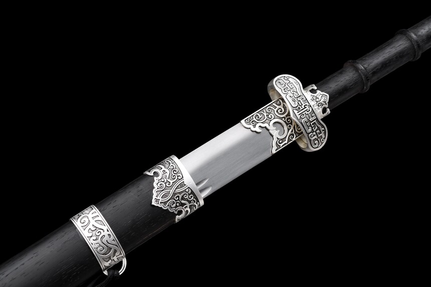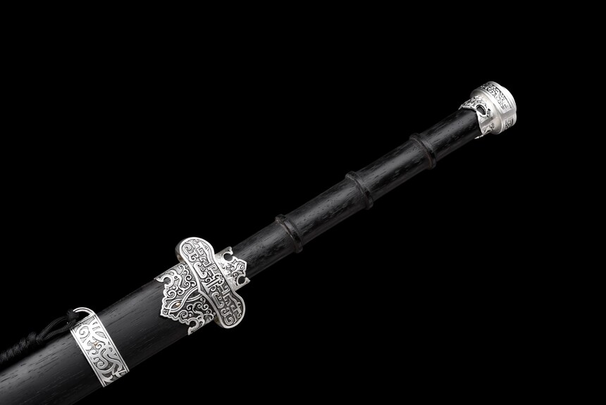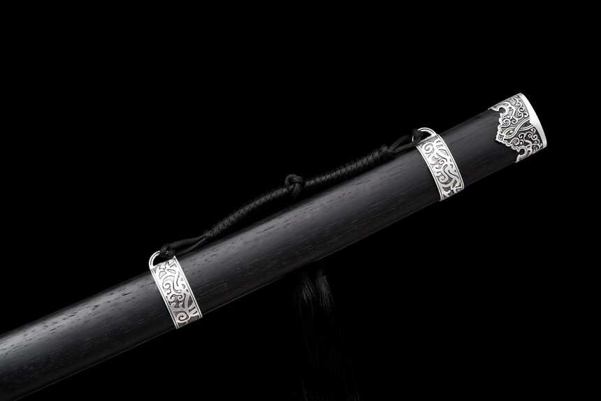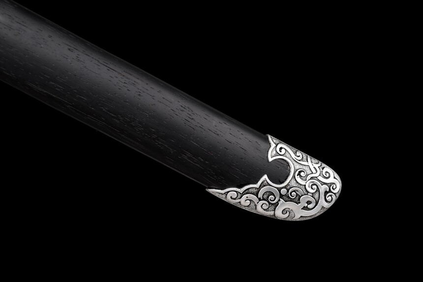 The aesthetic of the “Cold Moon” is defined by its masterful contrast of shadow and light. The Saya (scabbard) and handle are crafted from premium matte black hardwood, elegantly segmented for a secure grip. Piercing through the darkness are highly intricate, antique silver-finished alloy fittings. These metalwork pieces feature traditional scroll and cloud motifs, adorning the guard (Tsuba), pommel, and scabbard, giving the weapon the aura of a relic unearthed from a forgotten dynasty.
