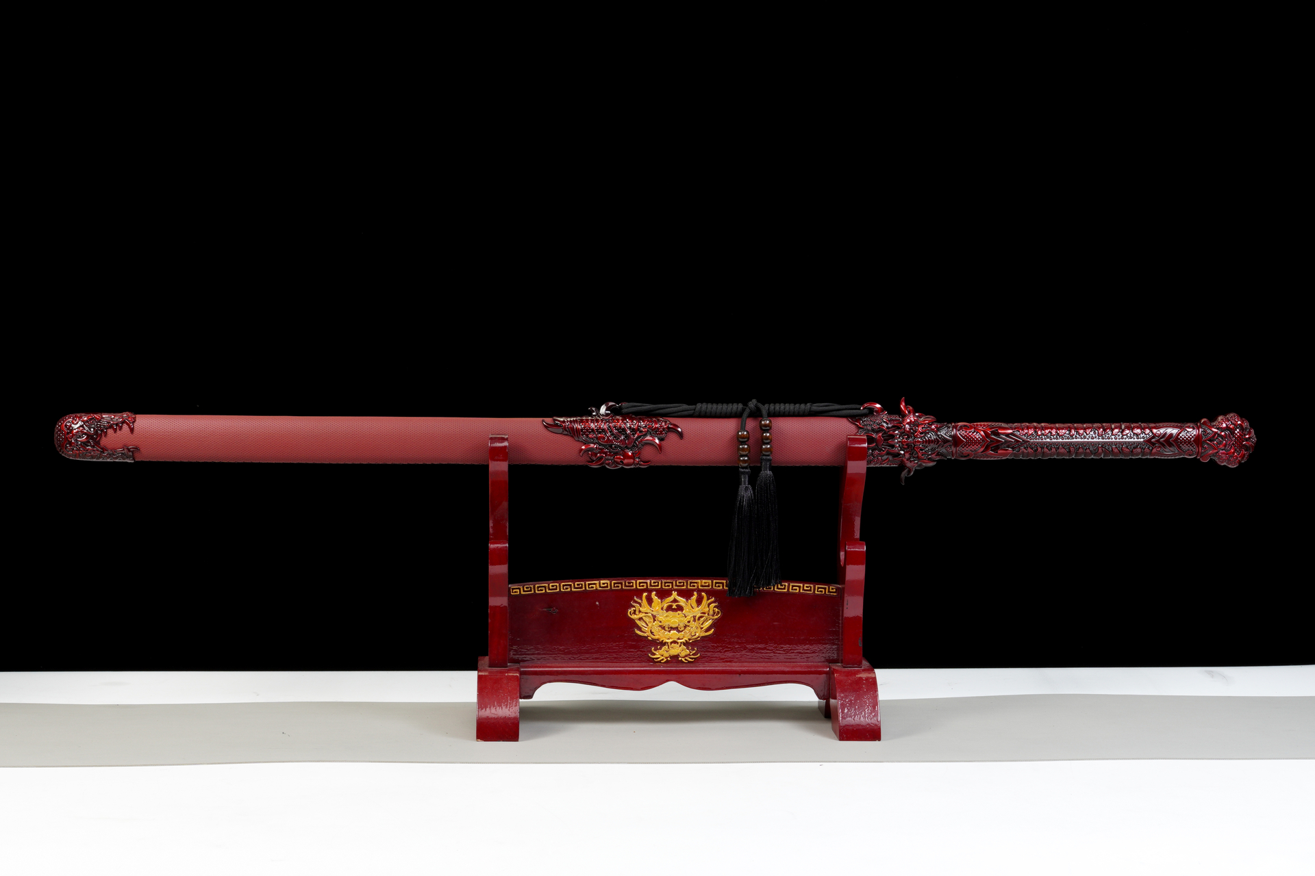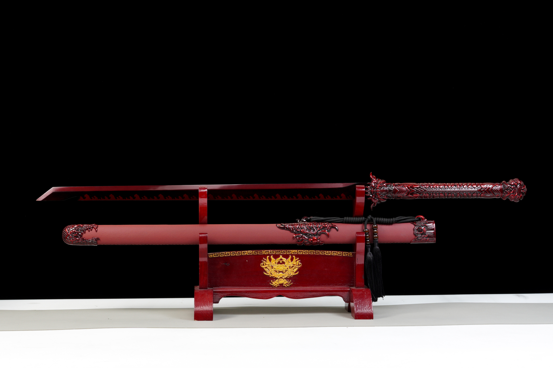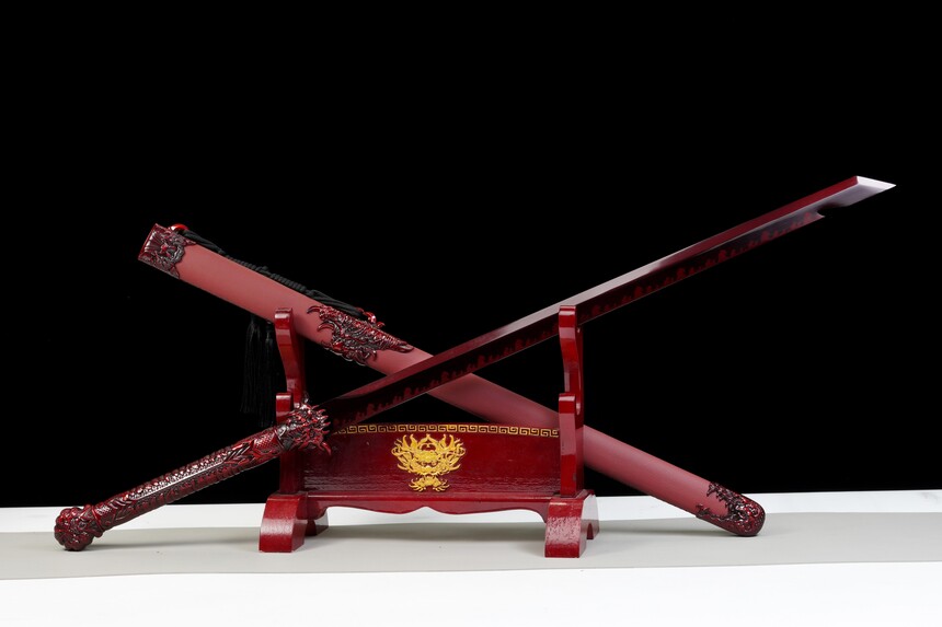 The hilt and scabbard are where the ‘Dragon’ comes alive. The handle is a sculpted masterpiece of zinc alloy, mimicking the scales and claws of a demon dragon in a deep crimson finish. The scabbard is wrapped in high-quality red leather, providing a premium tactile experience, and adorned with three-dimensional, high-relief dragon fittings that look ready to snap. ‘The Vengeance’ is more than a sword; it is a declaration of power.